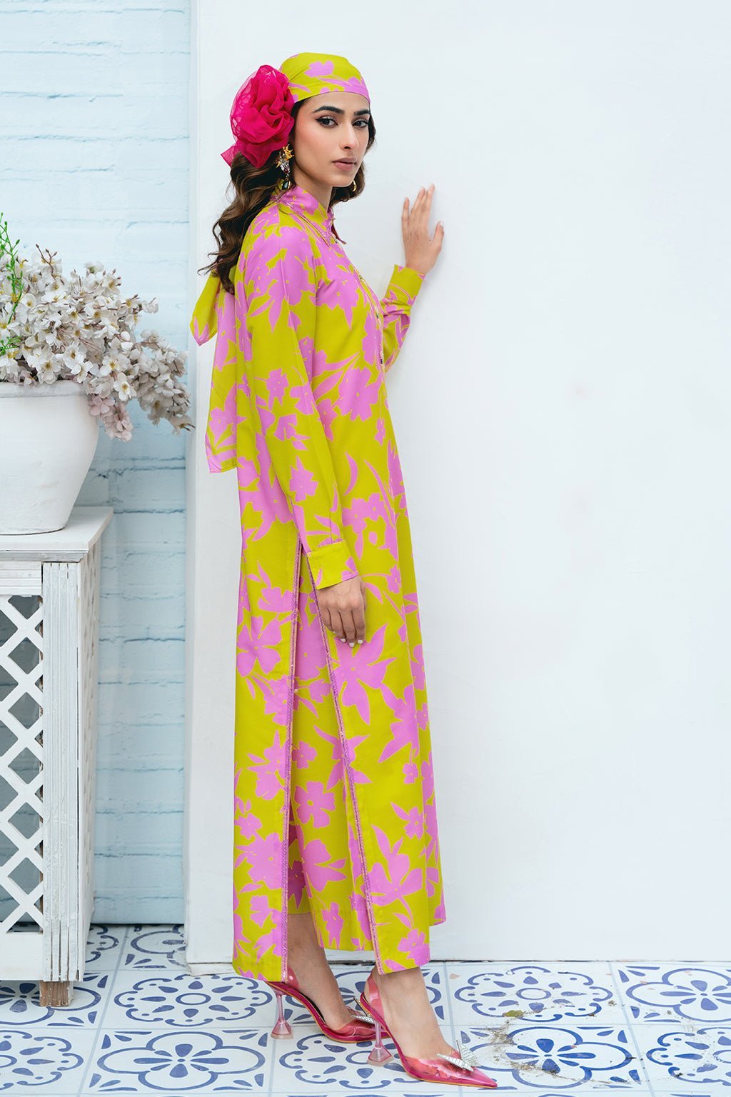 Young and bold contrast of pink and lime in an abstract print stitched in a long kameez having collar and paired with straight pants.