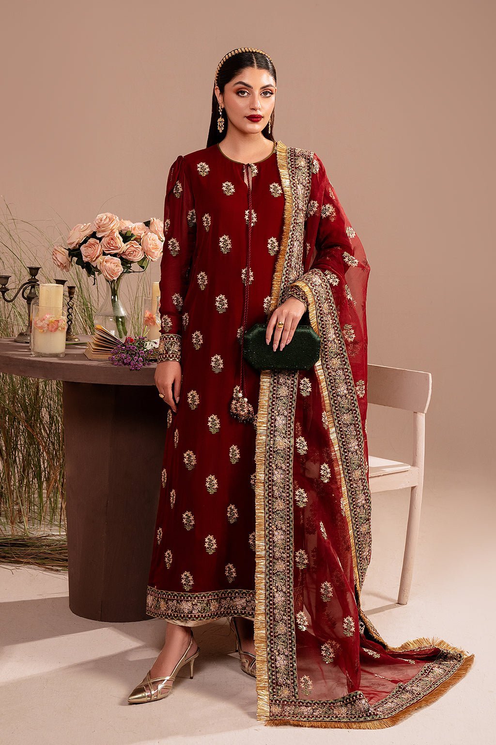 Deep maroon delicately embroidered motifs all over chiffon shirt and organza dupatta finished off with embroidered borders. Paired with raw-silk culottes.