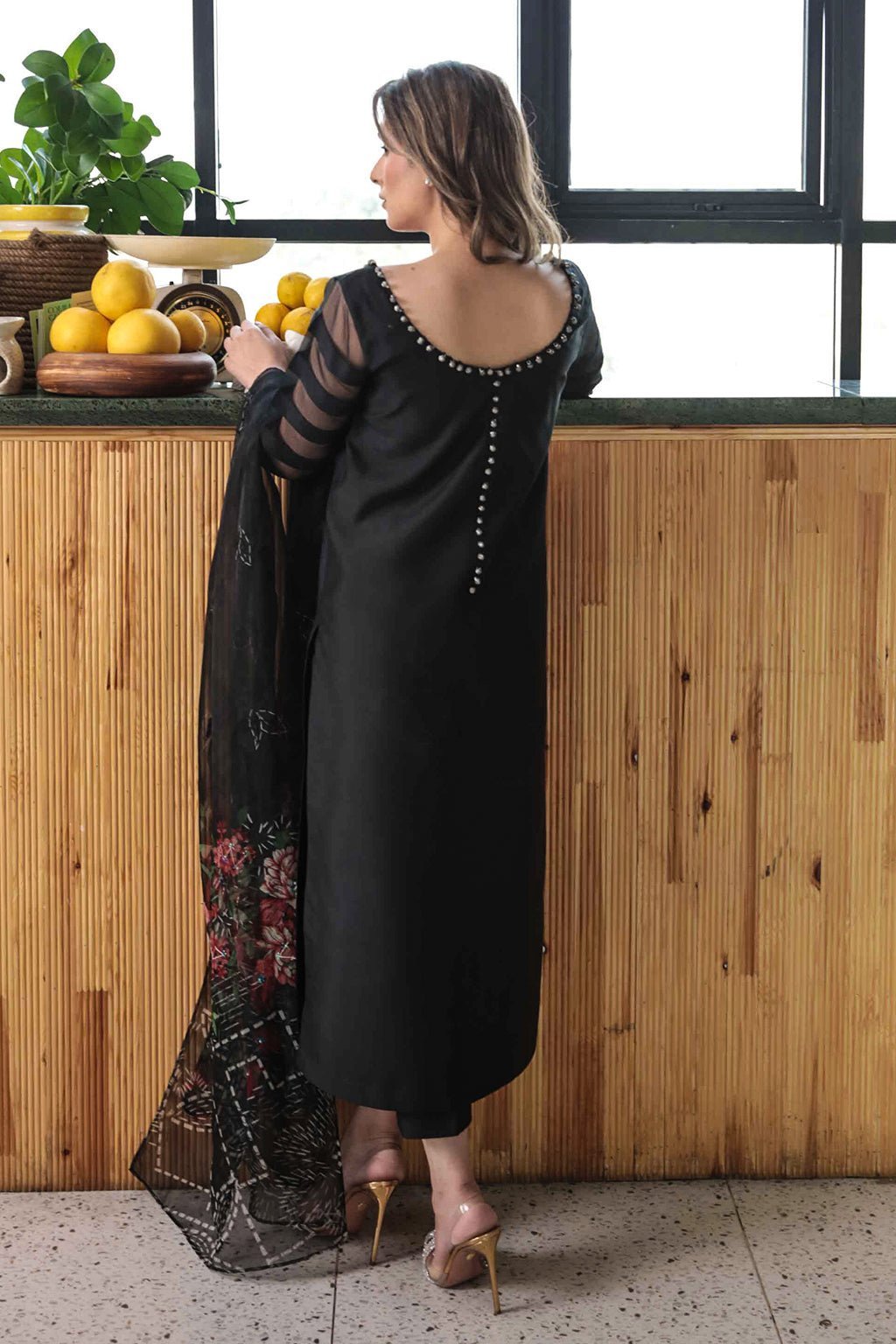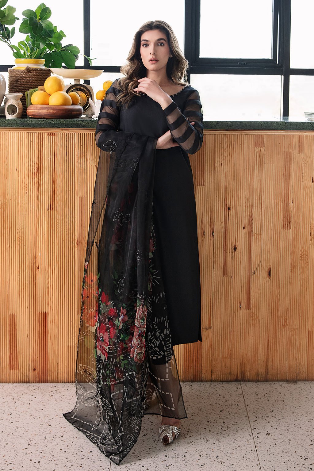 Black shirt with hand embellished neck line cut & sew panal sleeves, paired with cigarette pants & organza print hand work dupatta.