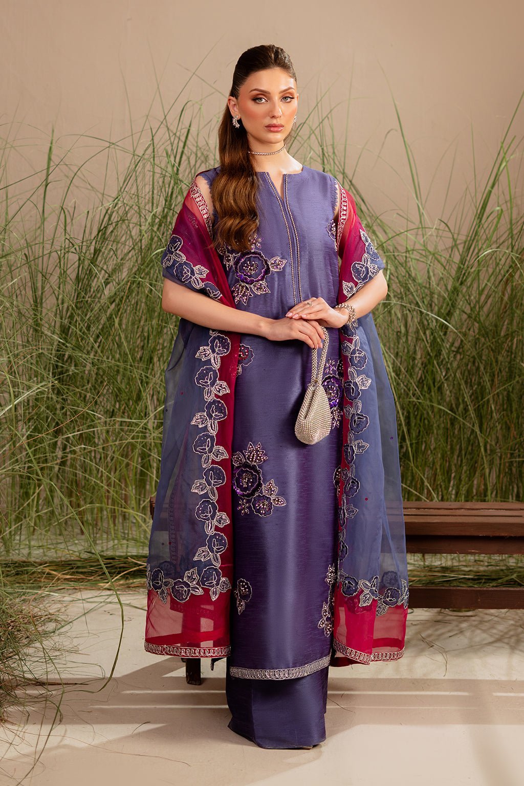 Light purple color shirt, having delicately done embroidered details enhanced with hand work, paired with culottes and embroidered dupatta.