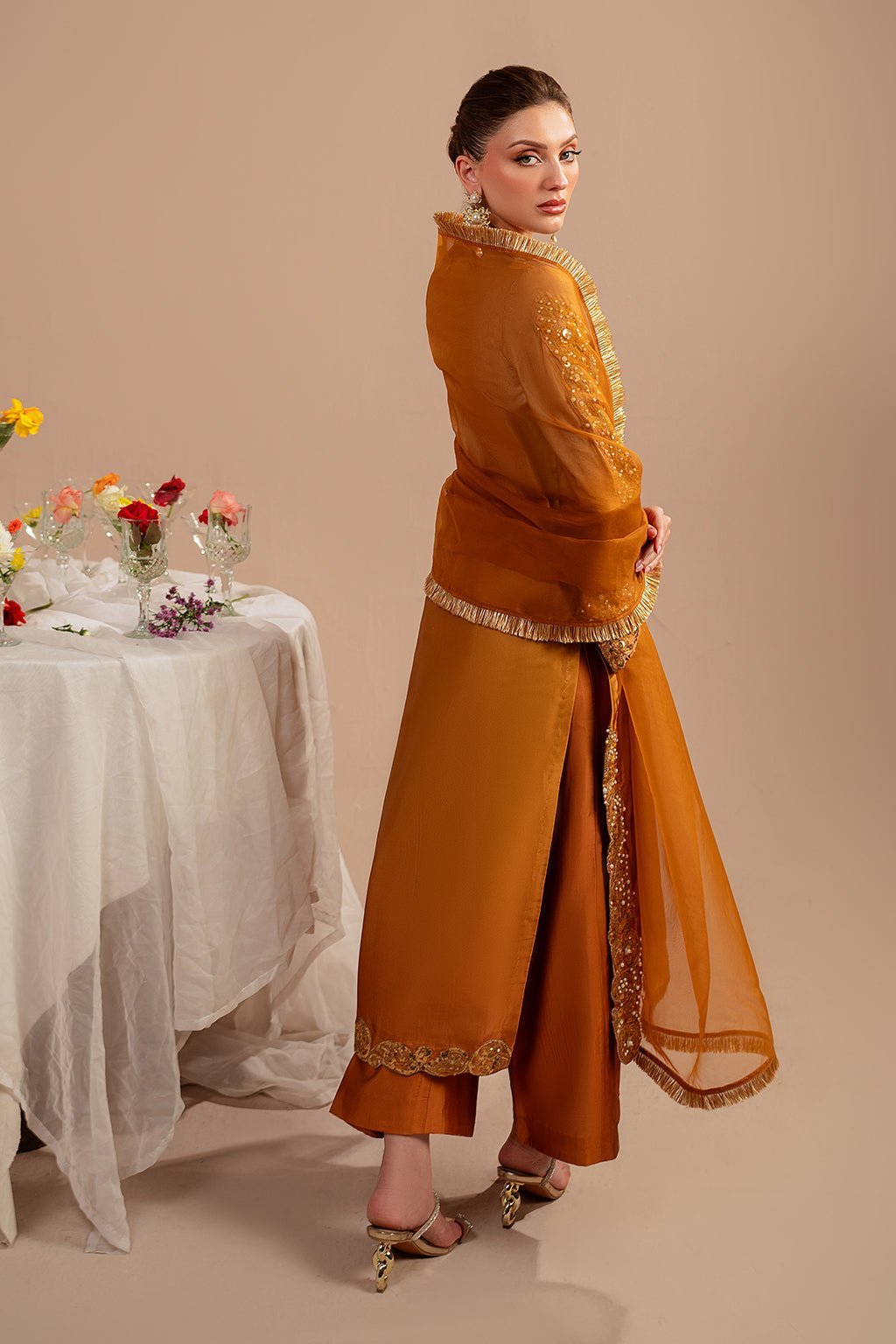 Ombr? silk shirt in shades of mustard, having delicately done embroidered details enhanced with handwork, paired with culottes and organza dupatta.