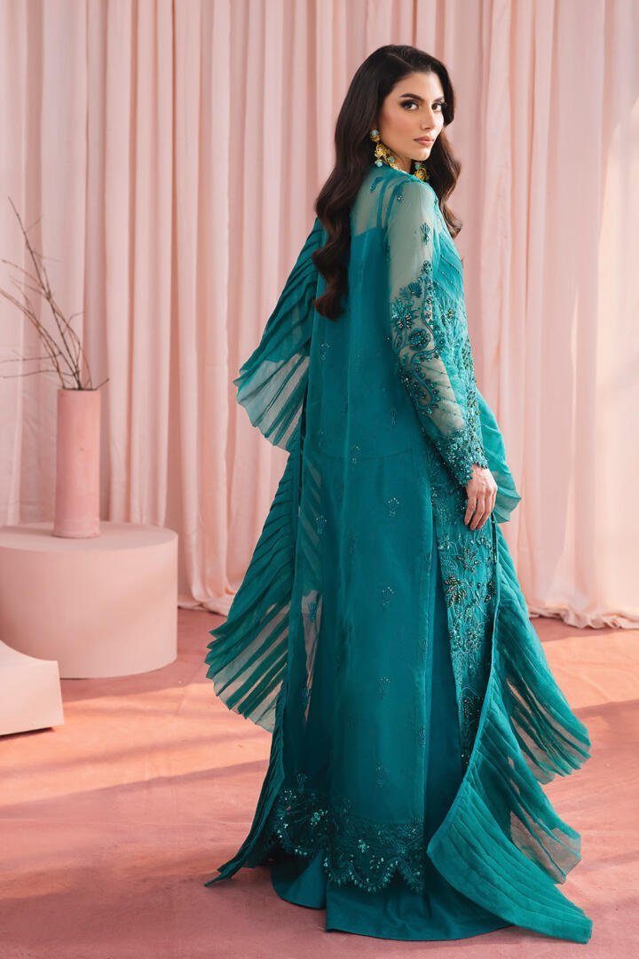 Heavily embroidered teal monotone embroidered and hand embellished front open jacket with flared pants, paired with hand pleated organza dupatta.